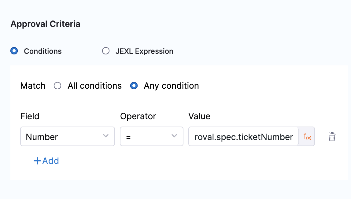 - If the resolved JEXL expression is a Boolean true, the approval criteria is met.